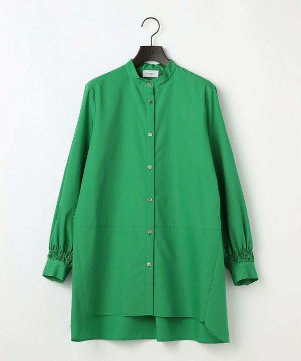モガオリジナルカラーの鮮やかなグリーンのバンドカラーシャツを