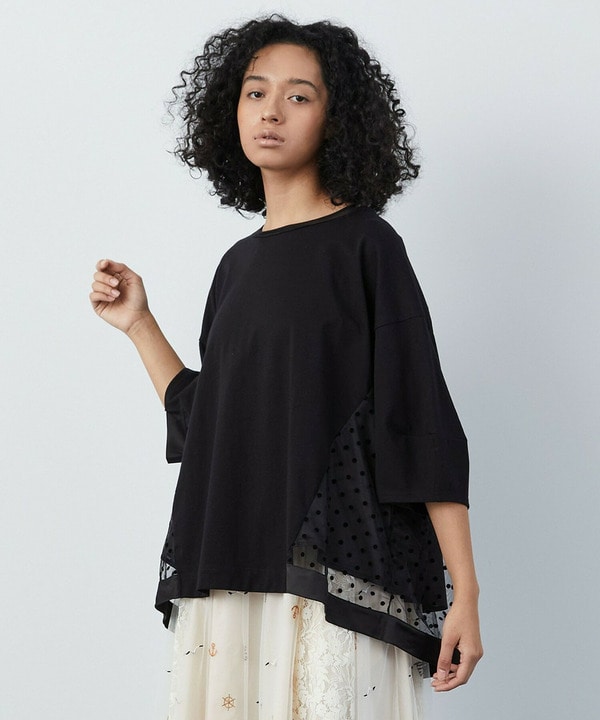 後ろ身頃にドットプリントの入ったチュールがドッキングされています。どんなボトムとも合わせやすいのでこの夏オススメの1枚です。