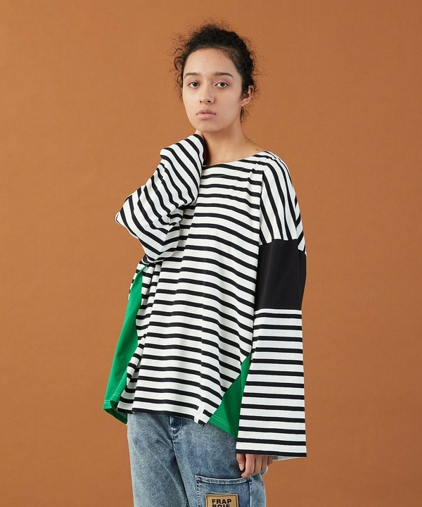 袖丈も長く、袖幅も広くなっていくデザインでそのままルーズに来ても良いですし、ロールアップしても可愛いシルエットに。