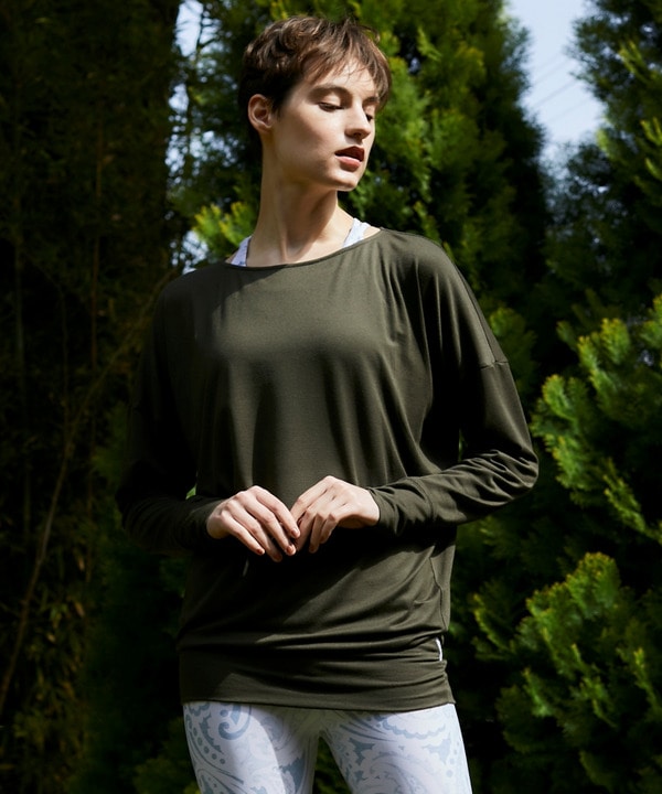 長袖のトップスは、袖には親指が入り、お尻周りは締っているので長さが自由に調整できます。首回りがひらいているので、サッと着られてレッスン中の脱ぎ着も楽々!