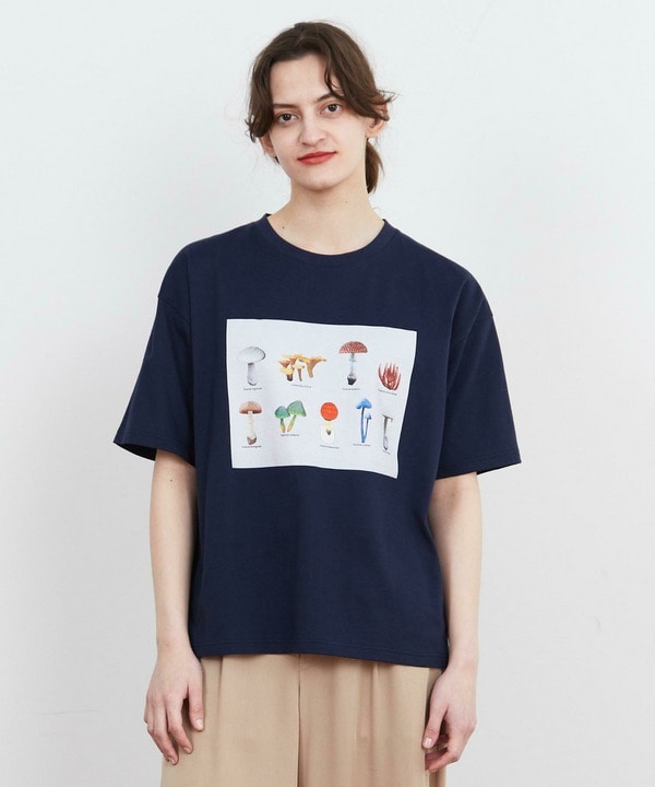 テンセル素材で光沢感のある上品なデニムスカートとシアーなニットカーディガンを合わせました。小物はキレイめに揃え、インナーをあえてマッシュルーム柄のTシャツにすることで、フラボアらしい遊び心のあるコーディネートにしました。
