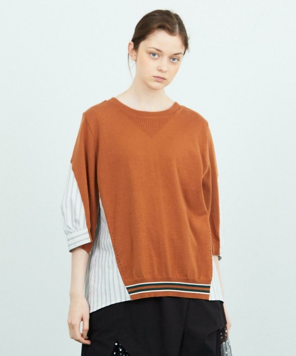 秋らしい色でまとめてみました。テラコッタカラーの異素材MIXのトップスと、アシンメトリーのスカートで遊び心満載なコーディネート。バックシルエットも魅力的なトップスは、夏の終わりから活躍する一枚です。