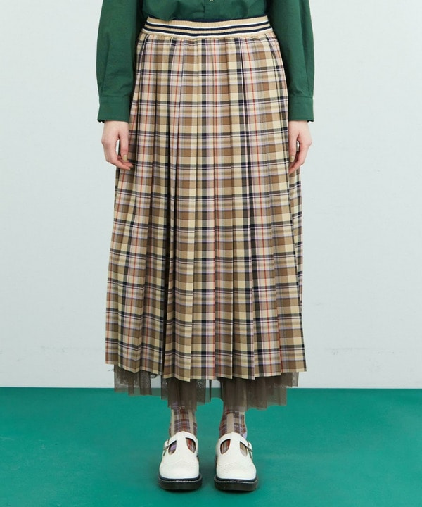 同系色のチェック柄スカートと合せて、統一感のあるコーディネート。