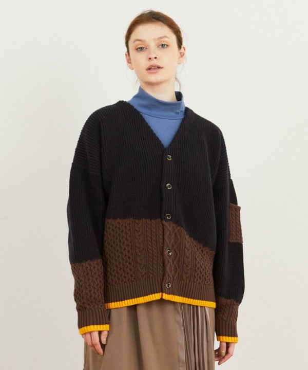 ケーブル編みをあしらったカーディガンは、ユニセックス展開です。トップスが肉厚なので、軽やかな素材のプリーツスカートをチョイスしました。スカートは360度どの角度からも違ったデザインが楽しめます◎