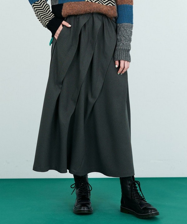 大きなお花の柄のニットと、ガンクラブチェックのふんわりとしたスカートのガーリーな組み合わせも、ブラック系のワントーンでそろえる事で大人っぽく着られます。