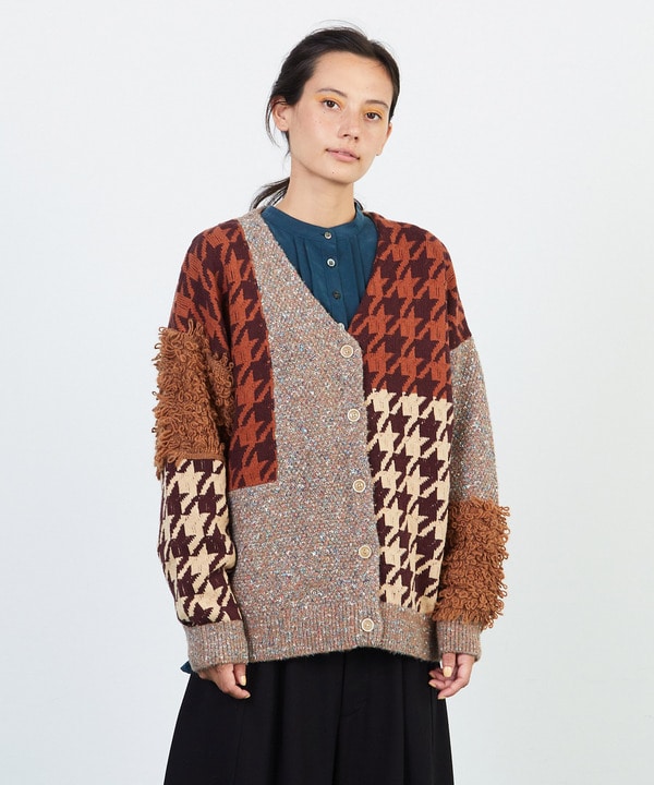 千鳥格子柄と、ツィード調の編み地、立体感のあるループ編みがドッキングされたカーディガンが主役のコーディネート。プリーツスカートのチェック柄の赤と、ブラウスのワインで、カラーリングがまとまるのでオススメです。