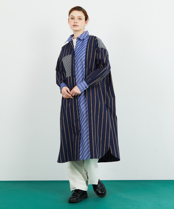 ざっくりとスリットが入ったロングシャツはボリュームのある変型パンツを組み合わせてもかさばりません。