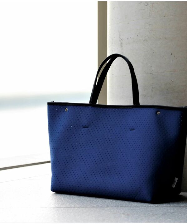 大き目で軽いブルーのトートバッグは差し色としても、機能面でも大活躍です◎