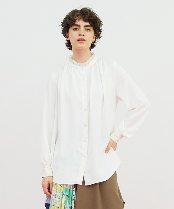 春らしいベージュとカラフルなプリーツがドッキングしたスカートと合わせた、ガーリーなコーデになりました。