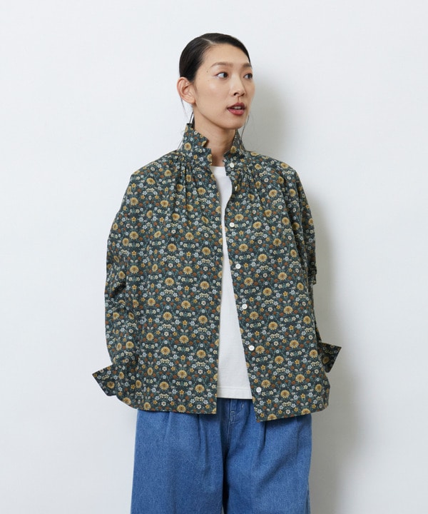 待ってました!リバティプリントシリーズ。ポップな花柄ですがグリーンベースなのでシックで合わせやすいです。クールな雰囲気のセットなのでロワズィール定番フリフリブラウスで甘さプラス。