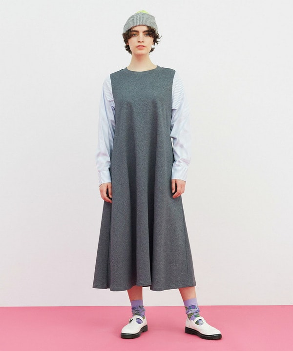 ワンピースは袖がストライプのシャツ生地になっています。