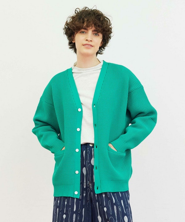 シンプルなデザインのロンTを、2月発売の鮮やかなカラーのカーディガンと合わせました。