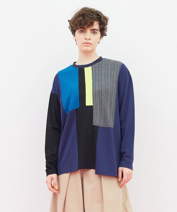 縦にも横にも伸縮性のある快適なサッカー素材のセットアップに、インナーには3種類の編み地のドッキングカットソーのイエローをアクセントにしてみました。初夏まで使えそうです!