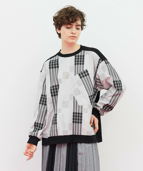ストライプやチェックなど様々な柄をパッチワークのように組み合わせたトップスに