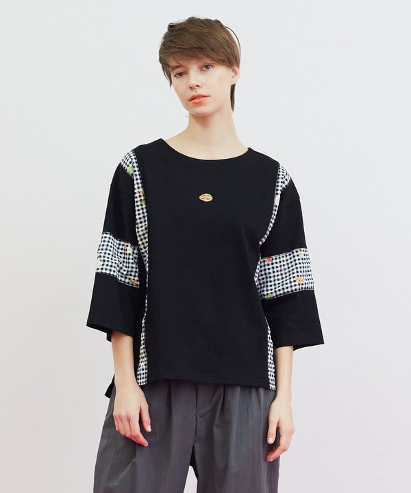 胸元のサンドイッチの刺しゅうが遊び心を感じるコーディネートです。