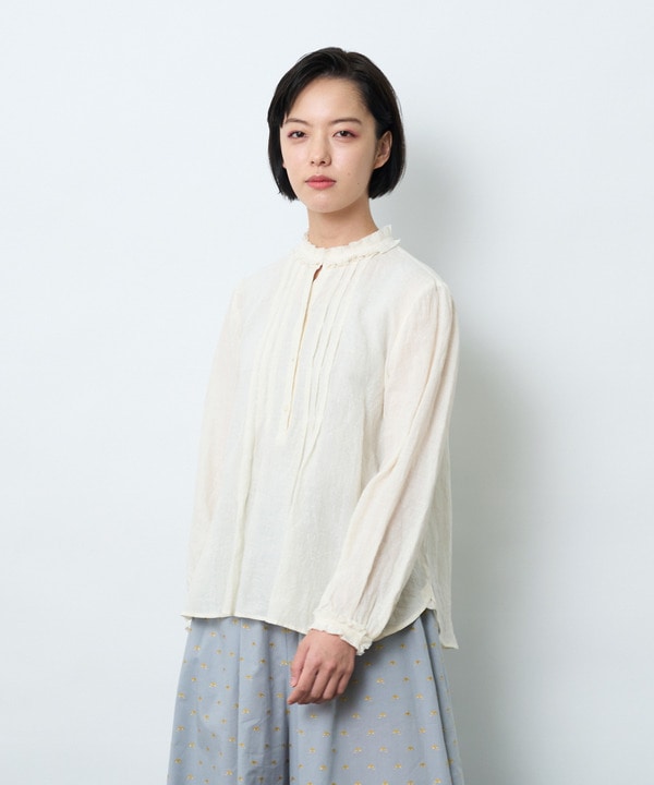 ジャンパースカートライクにブラウスをインしてみました。エキナセアの優しいカラーにはキナリのグランジリネンブラウスをチョイス。巾着バックがコーディネートを引き締めてくれます。