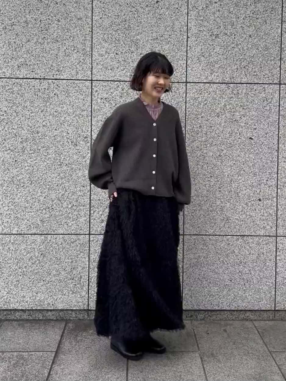 ふわふわな毛足がかわいいスカートを主役に。ボトルシルエットなので甘すぎないのがポイント◎トーンが暗めのコーデですが、インナーのピンクをアクセントにしました♡