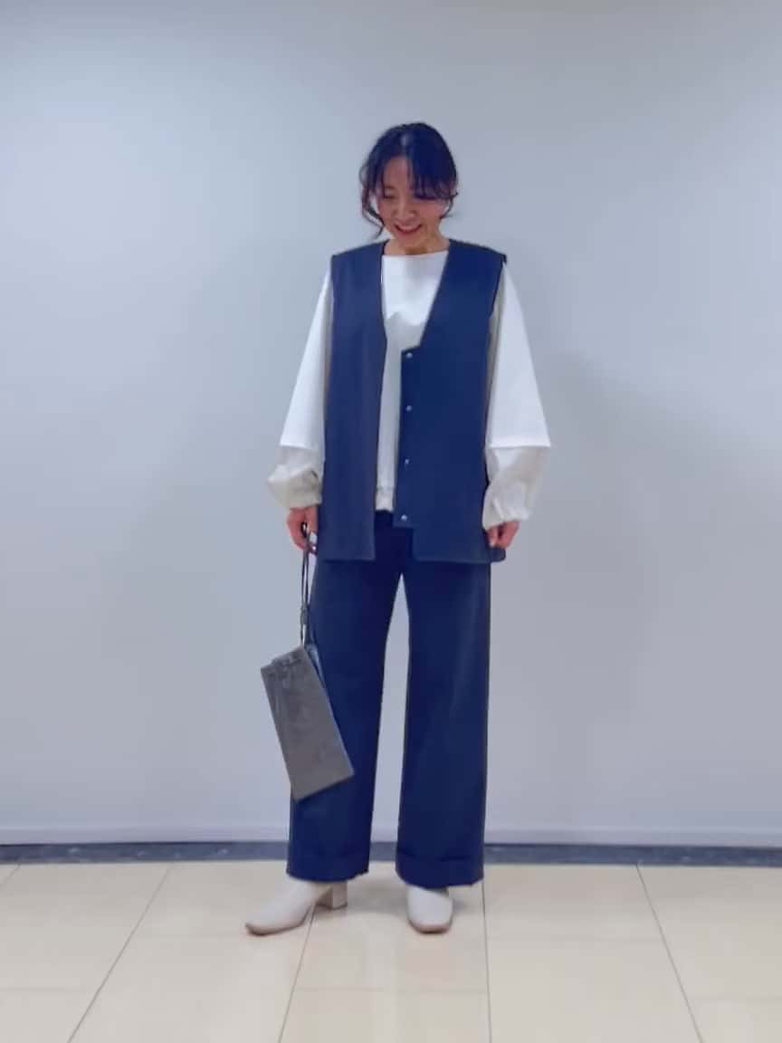 チャコールのジレとパンツのセットアップは、ストレッチも効いていて、着やすさ抜群です。