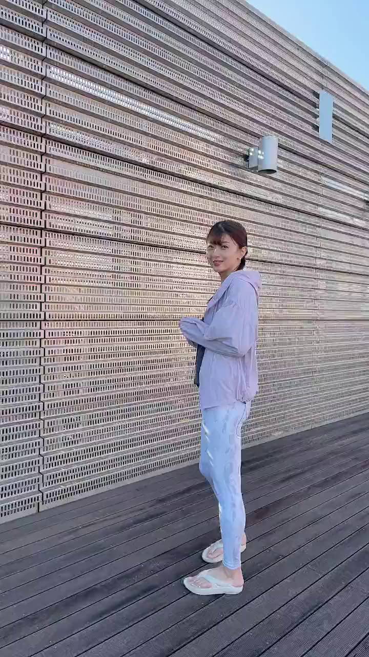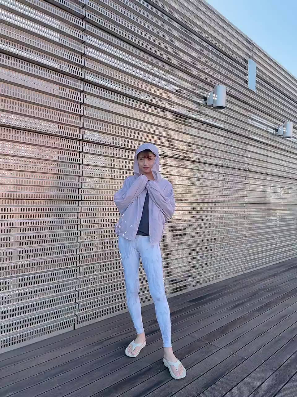 トップス:0(S~M)サイズレギンス:0(S~M)サイズアウター:F(フリー)サイズグレー×ホワイトのレギンスは、落ち着きすぎないように、ラベンダーカラーでキュートさを入れてみました。