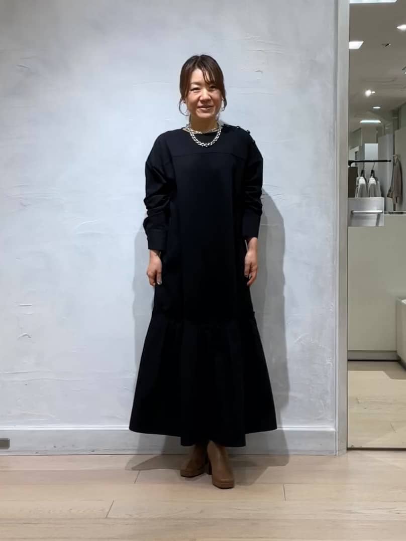 肩のアクセントボタン、裾切り替えのデザインが特徴です。
