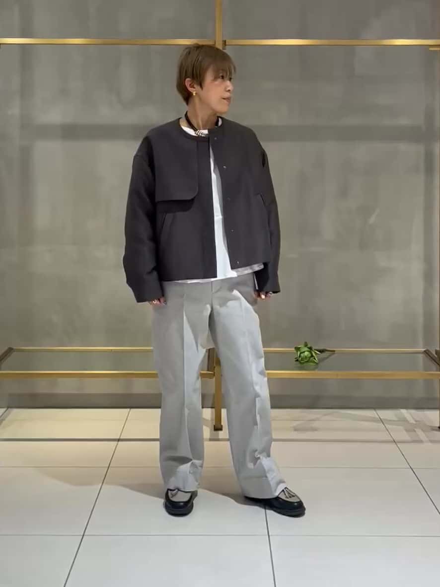 きれいめブルゾンをセミワイドのコットンパンツと合わせることで、マニッシュなカジュアルスタイルになります。