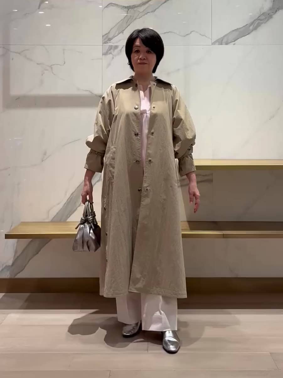 ステンカラーのシンプルなデザインでありながらバックにギャザーが入った