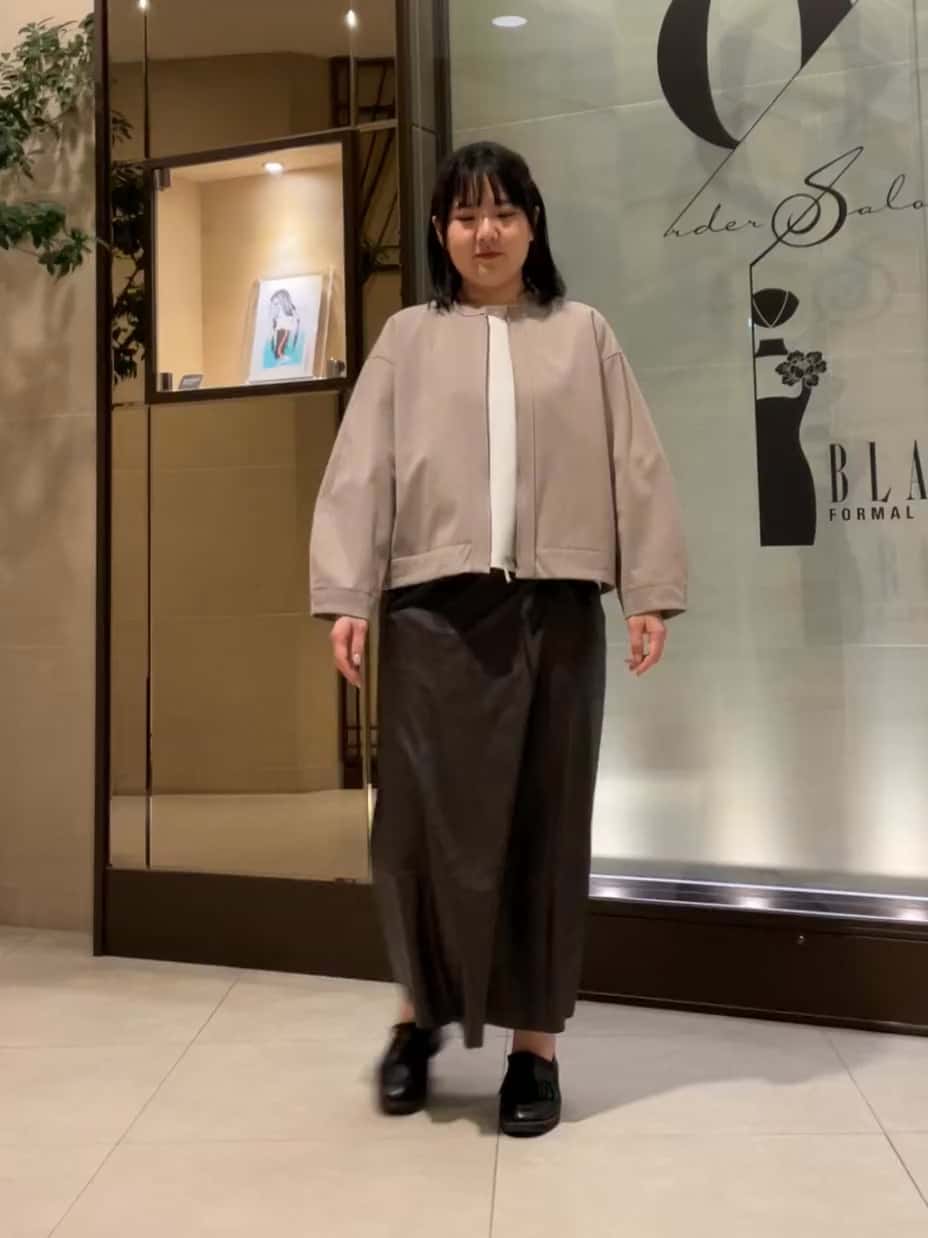 ジャージ素材のライトなジャケットにエコレザーのラップ風スカートを合わせました。