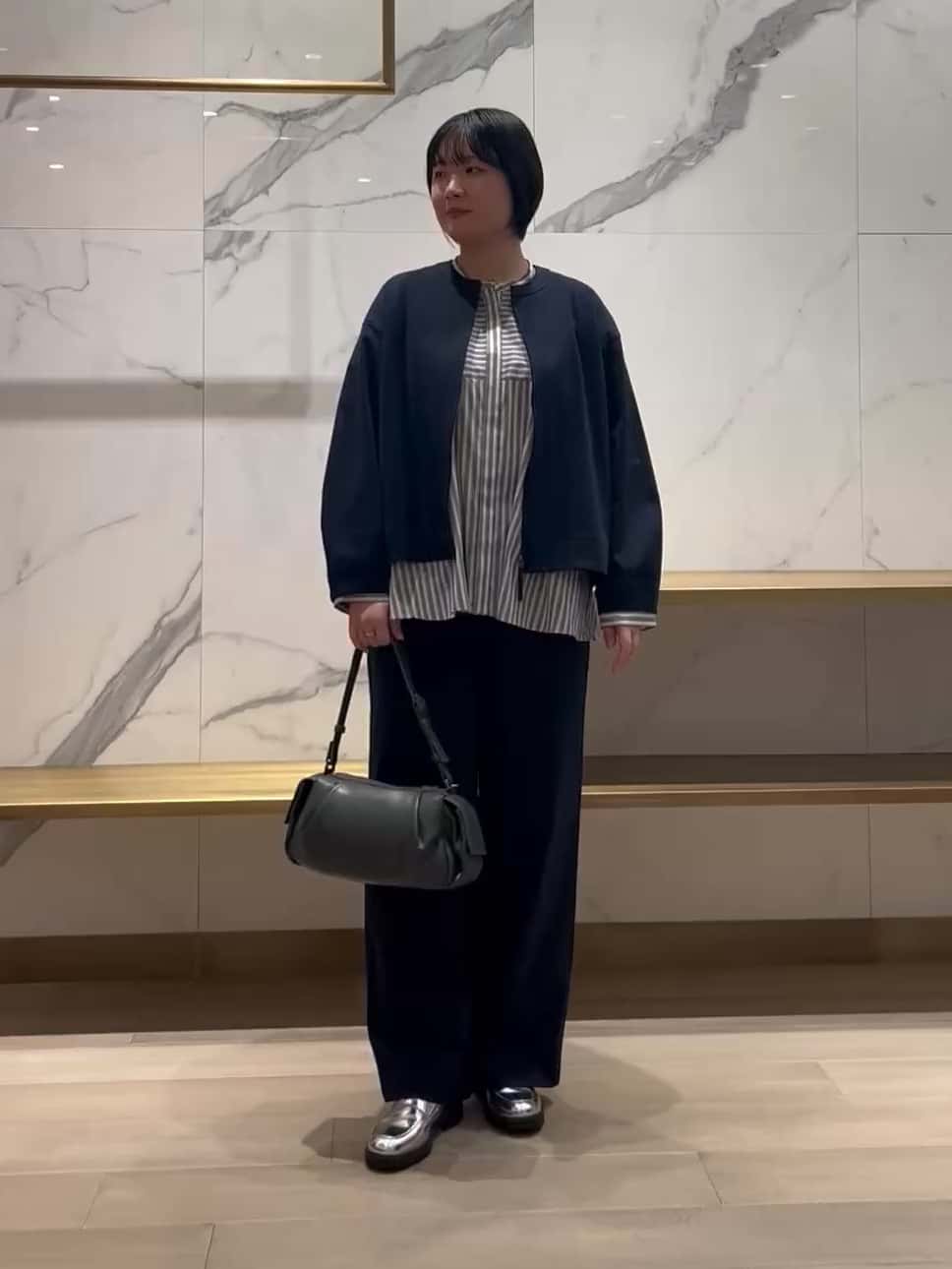 ネイビーが春らしいジャージ素材のセットアップにストライプのブラウスを