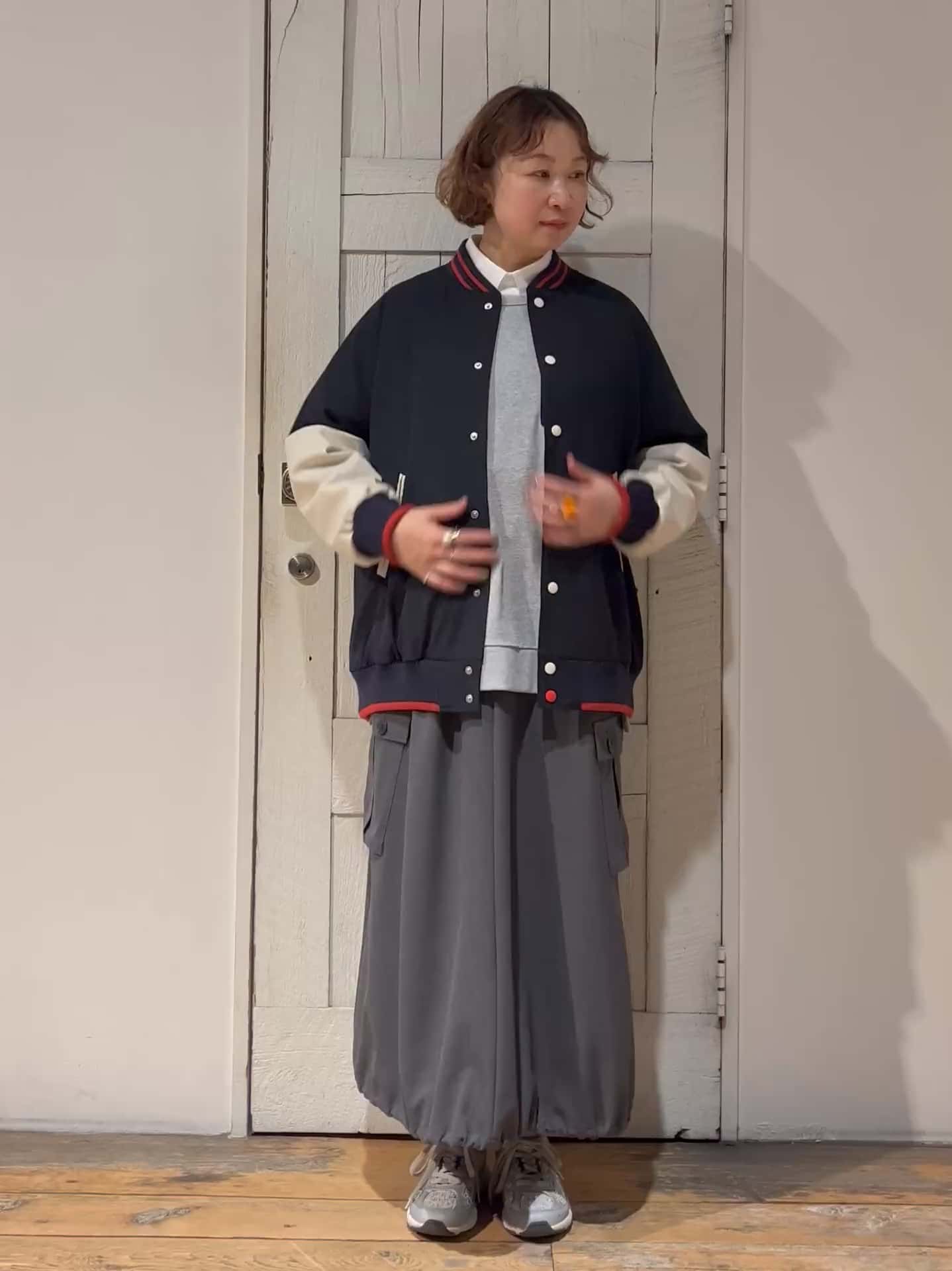 着用感 : ウール調素材と、袖とポケット部分はレザー調素材を組み合わせたスタジャン。