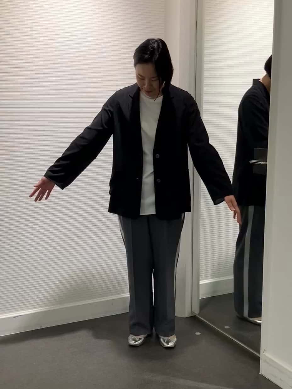 パンツは、太すぎないストレートシルエットのラインパンツ。少し太めのラインで