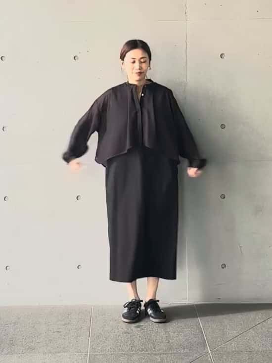 ブラウス部分はメッシュで、タックやギャザーでフォルムを出し、見頃はポンチ素材なので楽に着られます。