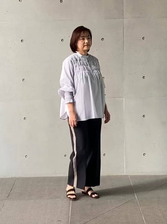 ラインパンツと合わせました。袖口がフリルになっているので、インナーとしてニットなどを合わせてもポイントになります。