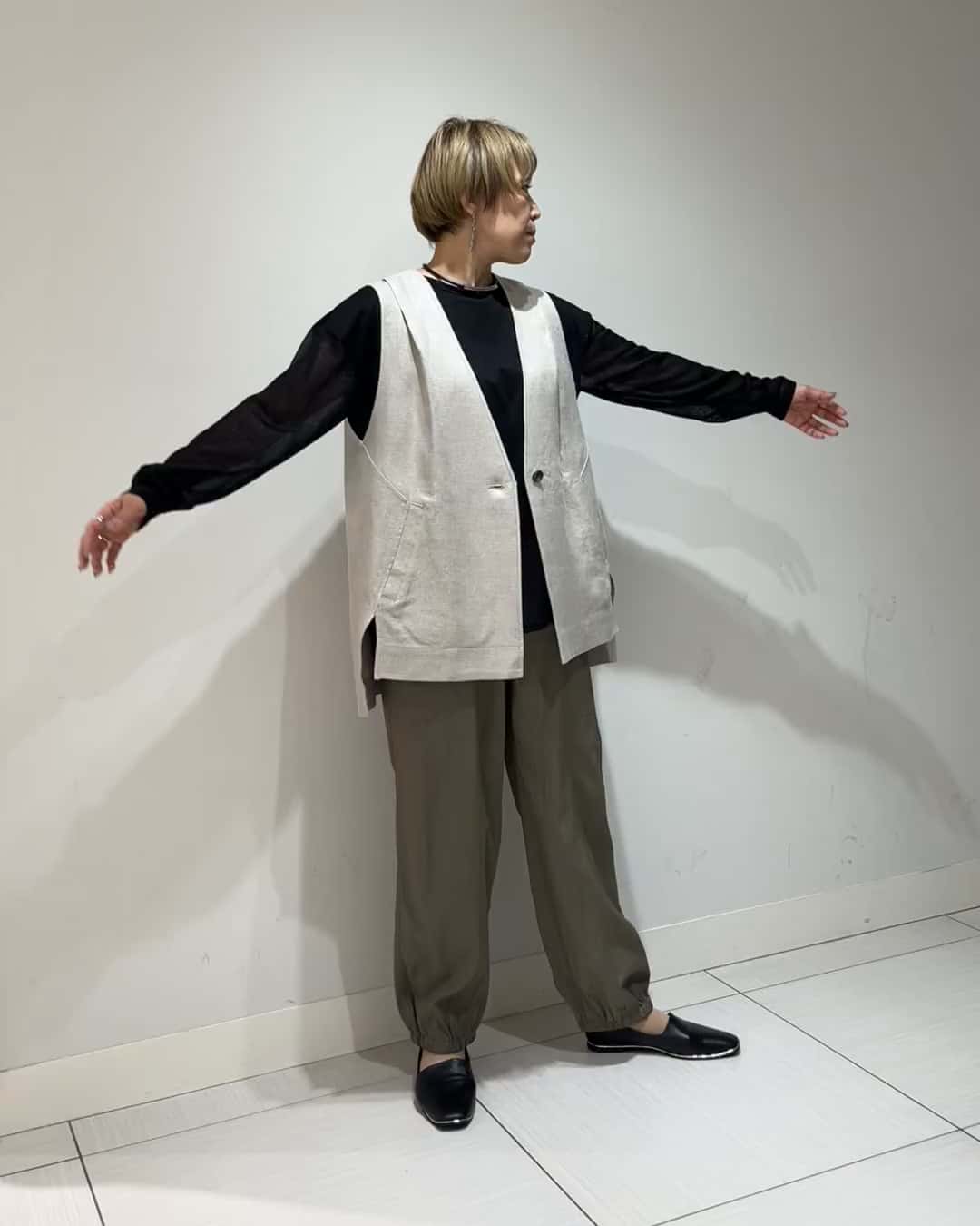 リネンのナチュラルな表情が春夏にぴったりのノーカラージレ。