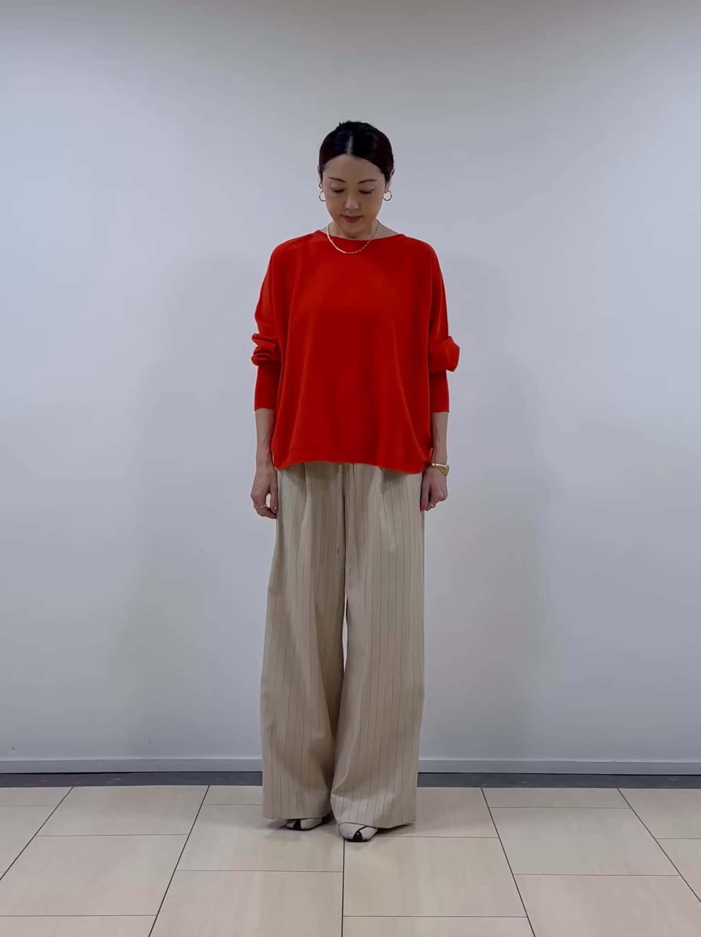 紐入りで調整可能です。クールな印象のピンストライプで、シンプルなトップスと合わせて