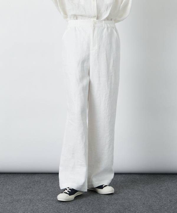 シアー感のあるラミーリネンワンピースは、色鮮やかな段染めが目を引きます。合わせたリネンパンツは白を選び、カラーが映えるキリッと爽やかなスタイルに。エナメルのワンストラップシューズはコーディネートを引き締めてくれます!