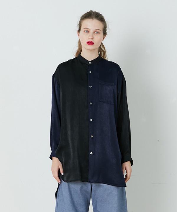 光沢のあるバイカラーデザインシャツはキレイ目な印象ですが、ゆるっとしたパンツと合わせる事でリラックス感も出せます。