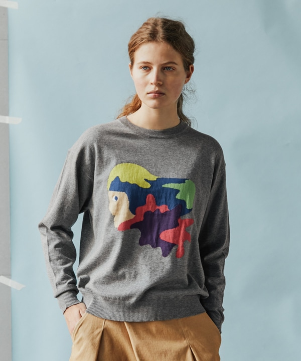イラストレーターの「田室綾乃」さんのアーティスティックなイラストが編み込まれたニットは、着心地の良さとお手入れのしやすさが嬉しい綿100%です。