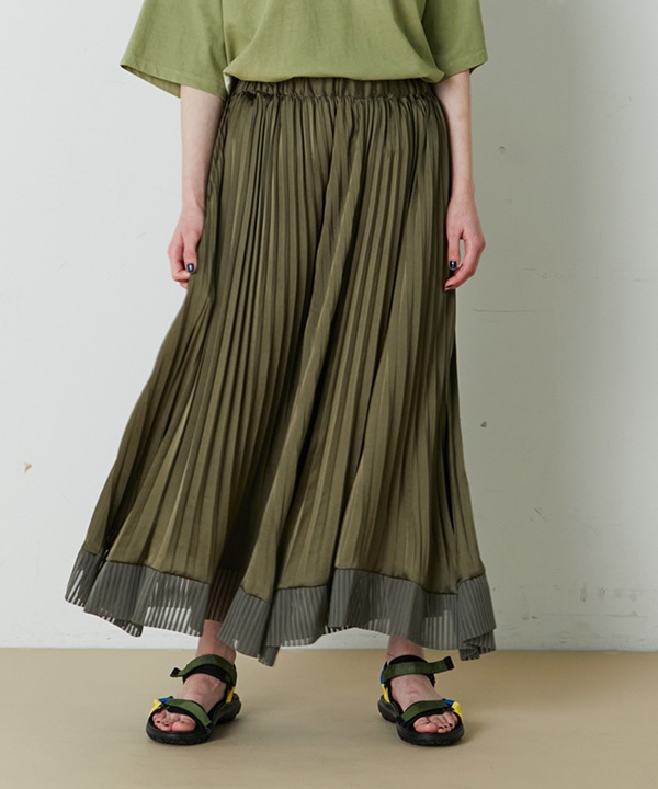 シンプルなクルーネックニットに、光沢感がキレイなプリーツスカートを合わせて、リラックスした春先のコーデになりました。