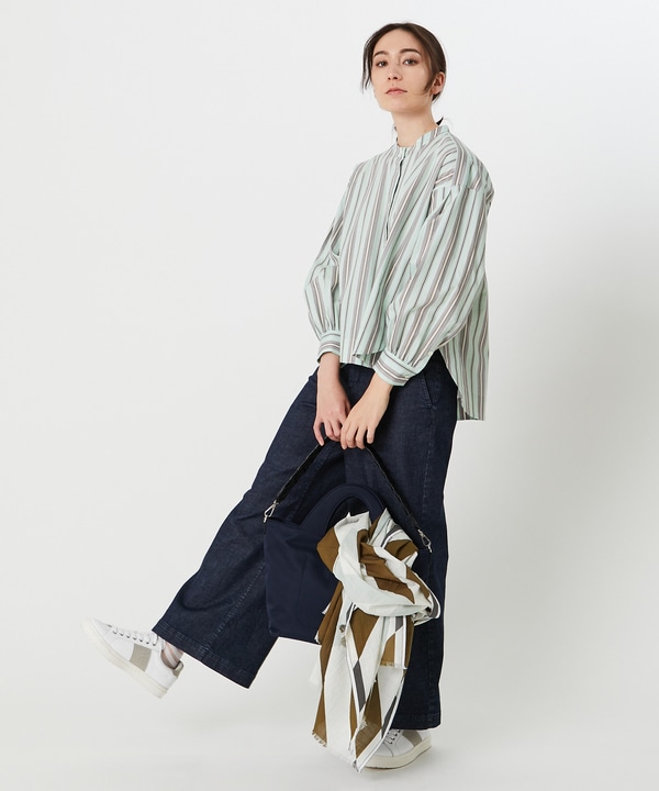 ミントグリーンのシャツとデニムスカートで清涼感のあるスタイリングに。