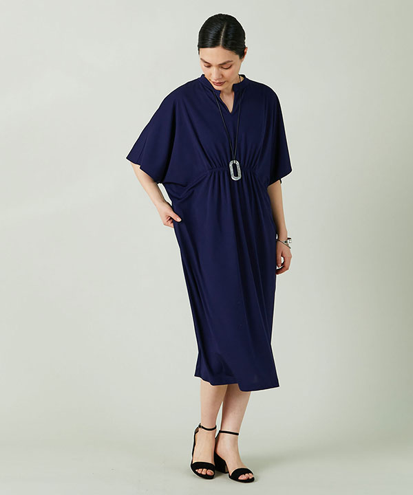さらっとした肌ざわりのジャージのワンピース。ウエストの高い位置にあるシャーリングがデザインポイントのコクーンシルエット。オンにもオフにも着用できるきれいめなリラックスワンピースです。