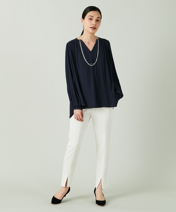 ネイビーのギャザーブラウスでコーディネート。