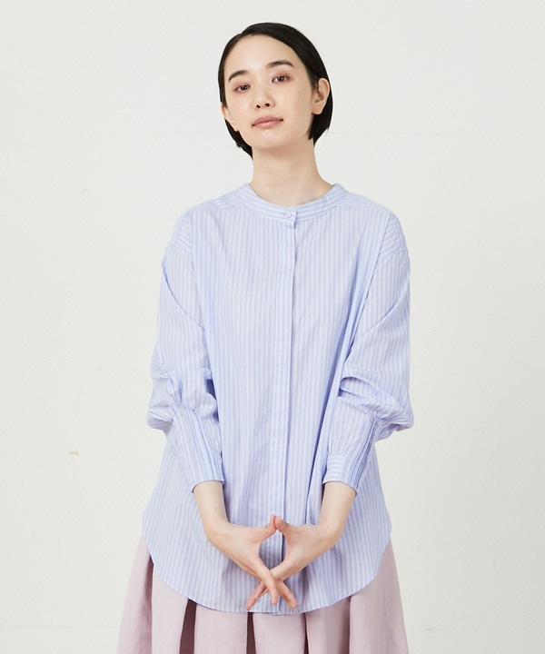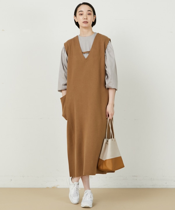 バンドカラーのシャツとジャンパースカートのフェミニンなコーディネートにハイカットスニーカーで抜け感を作りました。シャツもジャンパースカートも前後着用可能というお得感もある優れものです。