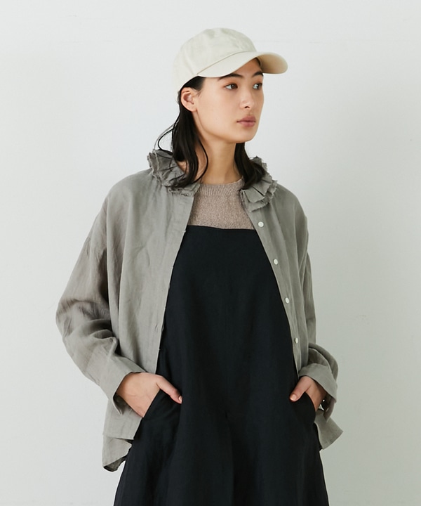 人と差がつく女性らしいフリルカラーがポイント。バックスタイルのピンタックがアクセントになっています。カーキカラーにホワイトパンツを合わせて自然体で爽やかなスタイリングに。