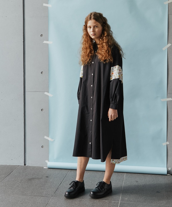 ブラックワントーンのシャツワンピ×ロングスカートの組み合わせはモードな雰囲気ですが、カラフルなイラストがかわいらしさもプラスしてくれます。