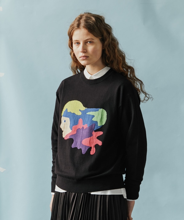 ブラックのサマーニットは、カラフルなイラストが映えるモードなデザイン。