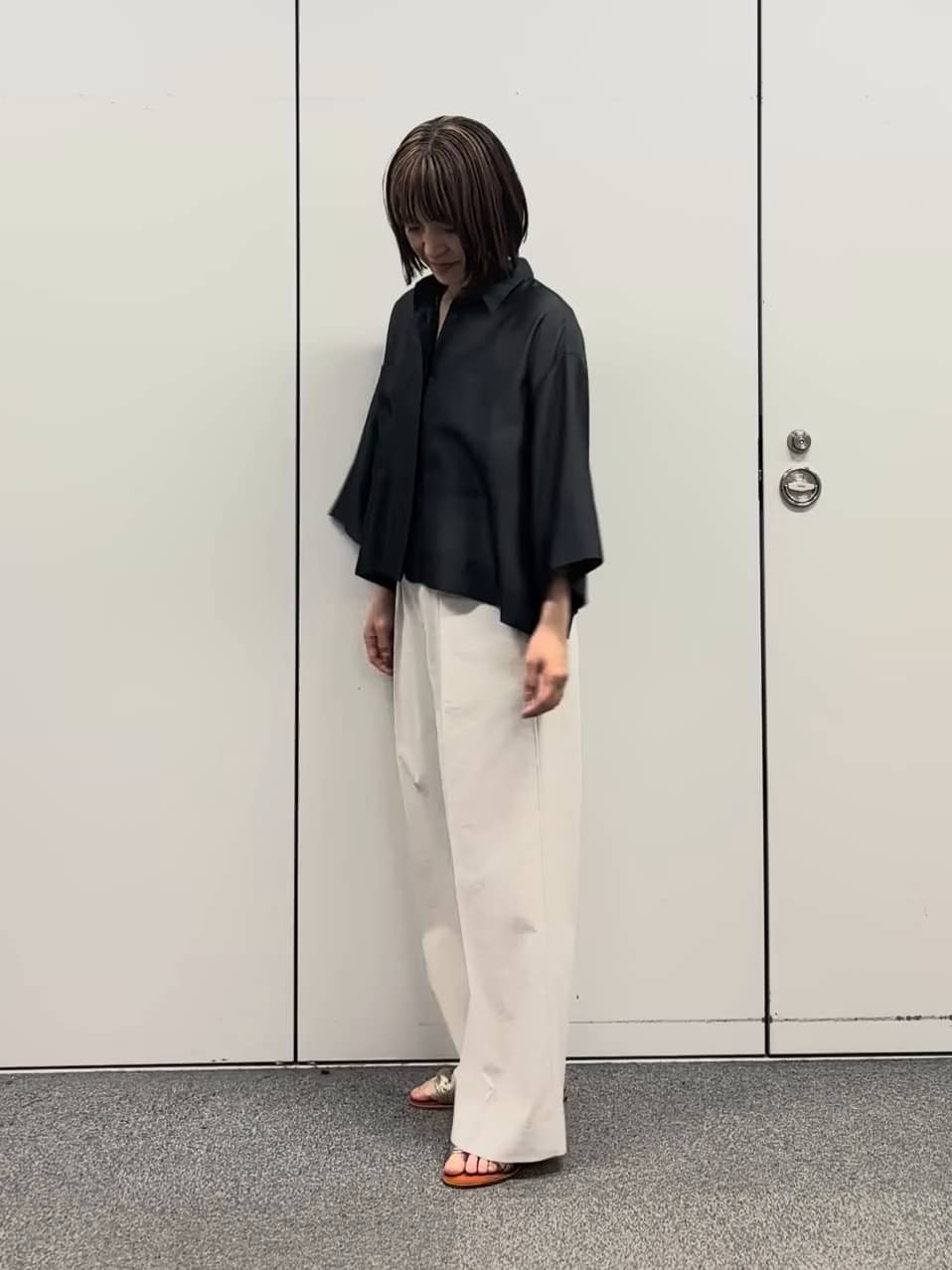 シャツ襟のリラックスシルエットのブラウス。7分袖くらいの長さがあり気になる