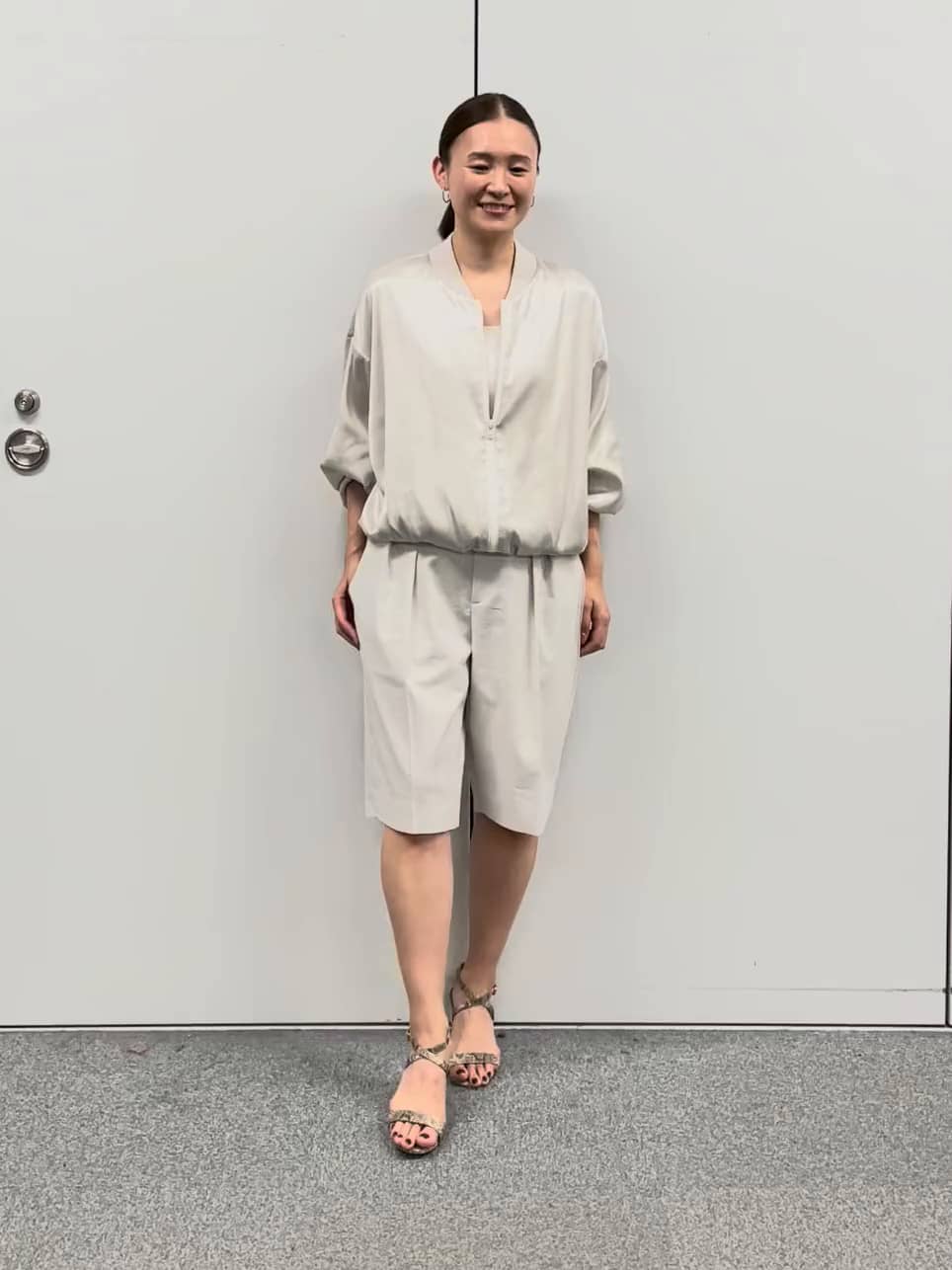 光沢感のあるサテン地のブルゾンにトレンドのハーフパンツを合わせました。