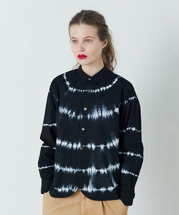 「シボリ染め」加工した生地を使って作ったデザインシャツのコーディネート。
