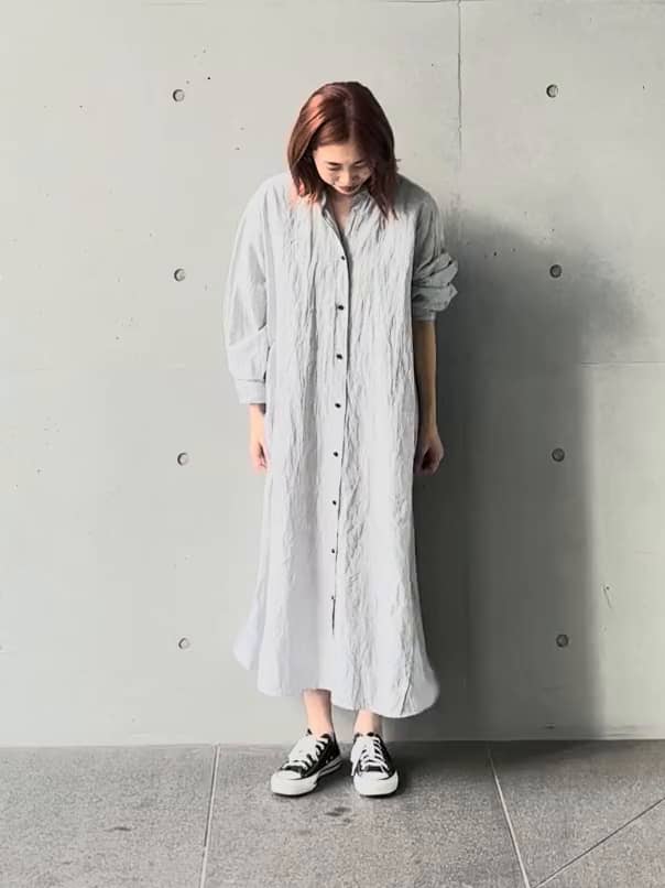 オーバーサイズのシャツワンピース。スキッパータイプで首元をすっきりとみせてくれます。