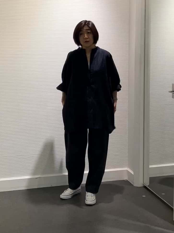 抜け感をプラスしています。ワイドスリーブの6分袖丈で気になる二の腕もしっかり